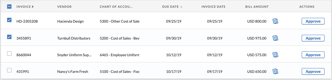 Select the bills you want to approve. By approving a bill, you are confirming that it is valid, correct, and okay to pay. You can also choose to deny a bill if it is incorrect or assigned to the wrong approver.
