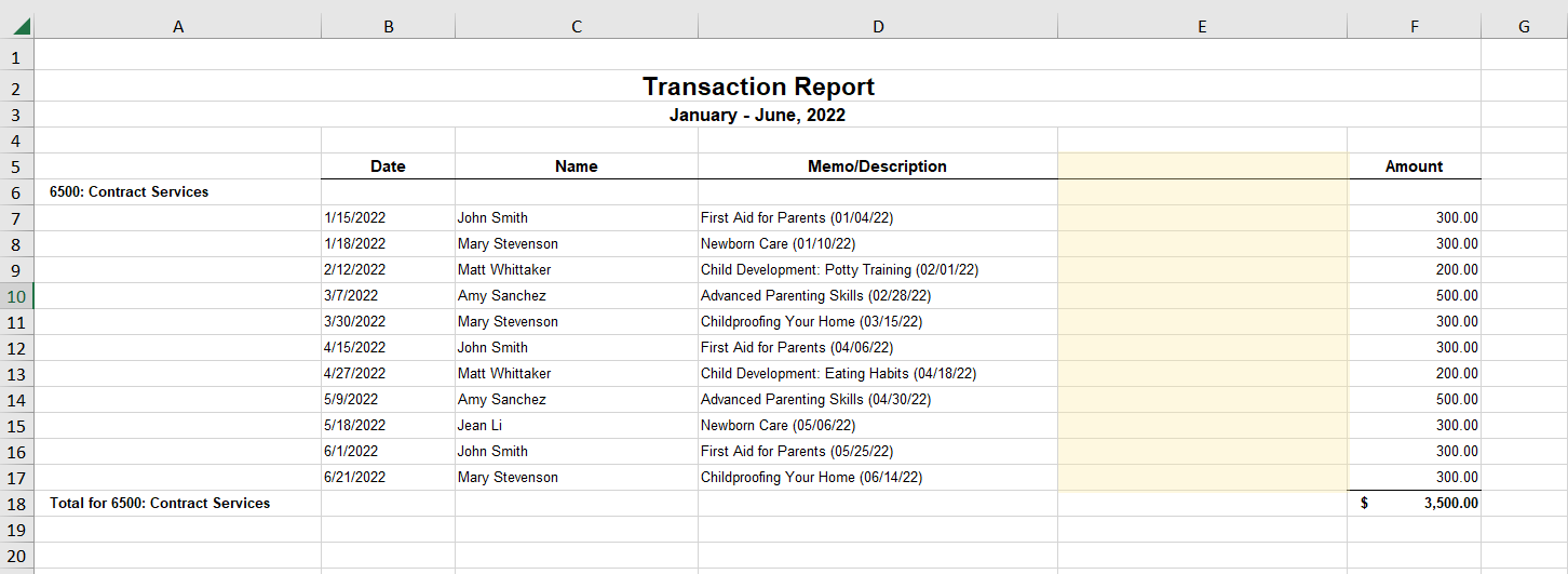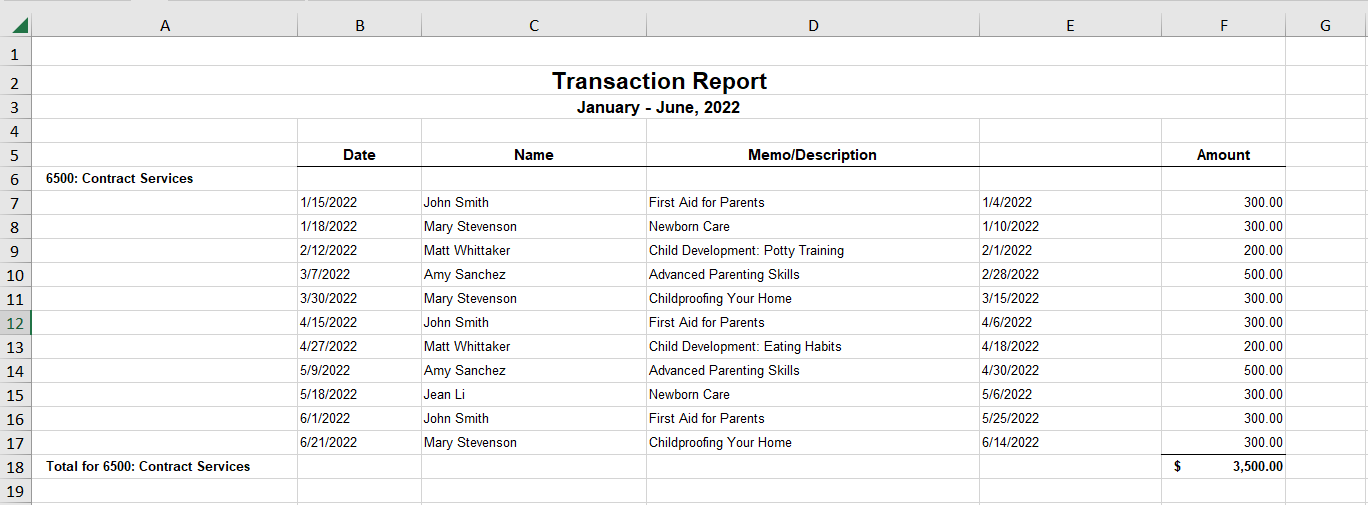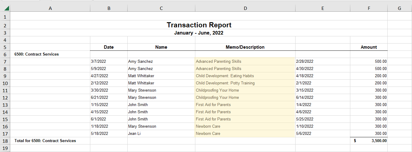 For example, let’s say your mission is to provide free educational workshops for parents. Your organization contracts with several different instructors to lead these workshops. When you pay these instructors for their services, you always include the workshop date and the name of the workshop in the expense description.