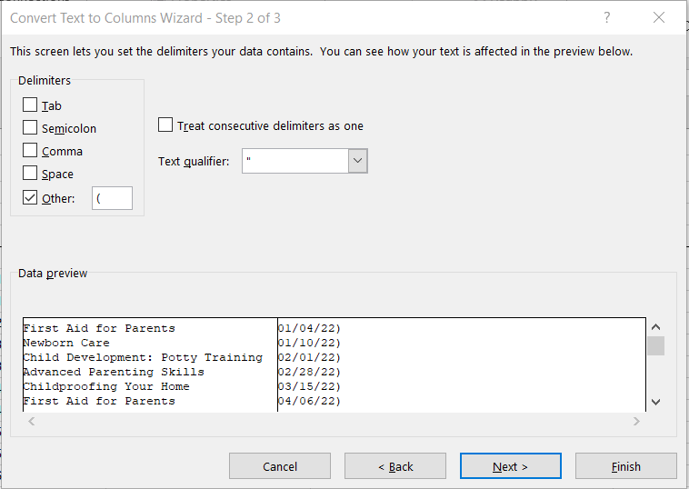 On the next screen, choose how you want to separate your data. The standard options are tabs, semicolons, commas, or space. But you can choose any other character instead. In this example, the date portion of the description is separated by parentheses.